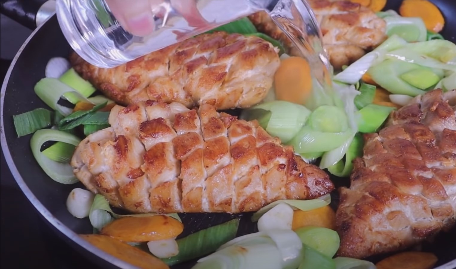 Połączyć warzywa z piersiami z kurczaka i dodać 3 szklanki wody, aby wszystko przykryć.
