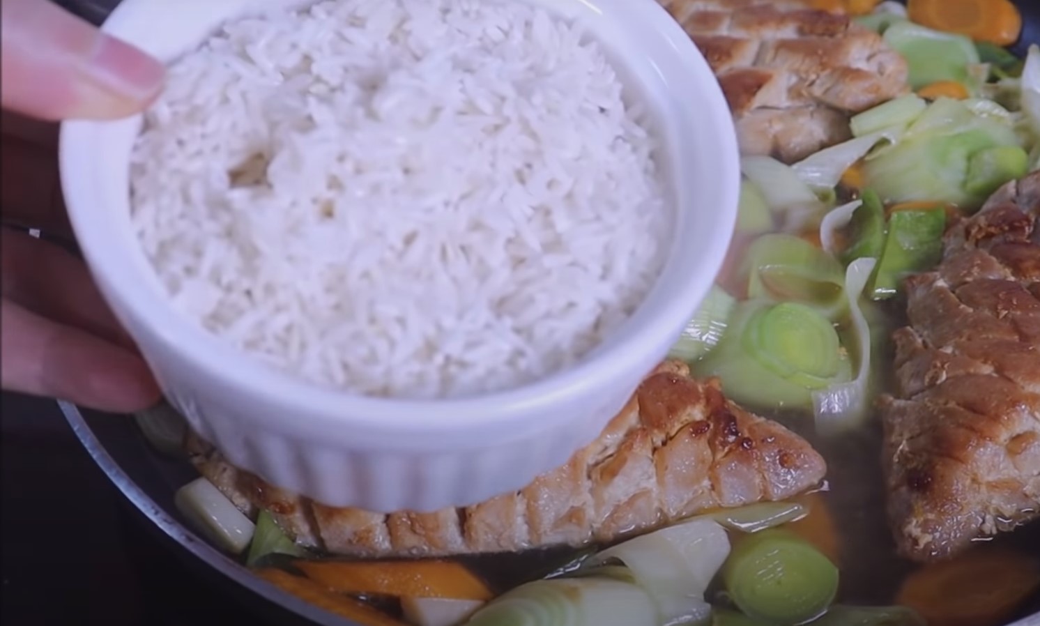Posolić, przykryć garnek pokrywką i gotować na wolnym ogniu przez 10 minut. Następnie dodać ryż i kontynuować gotowanie do miękkości.