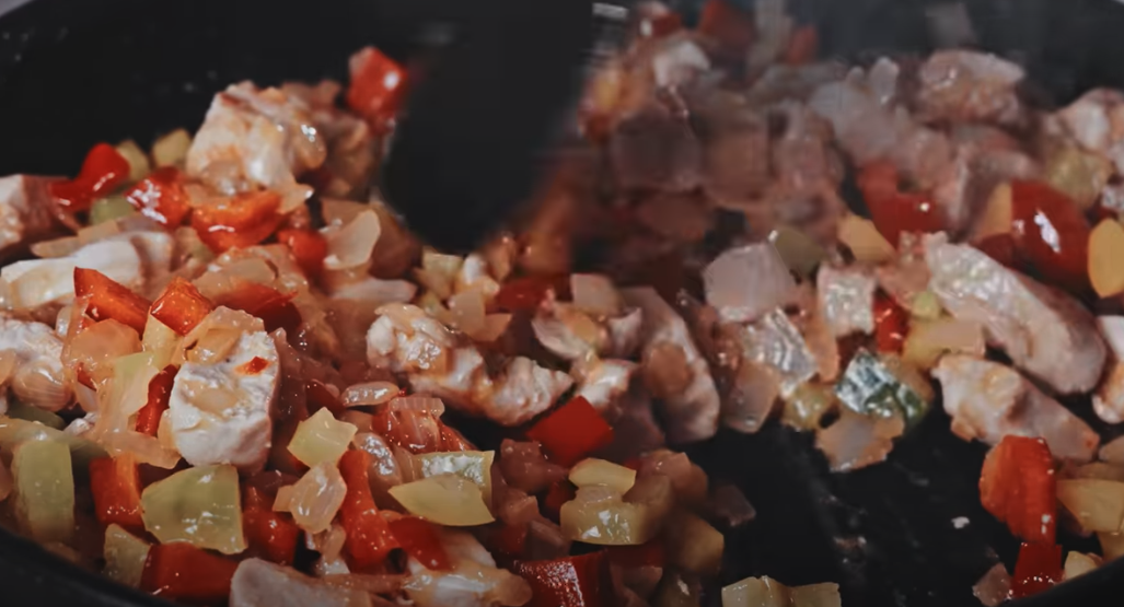 Pokrój słodką paprykę w paski i dodaj do patelni, smaż przez 6 minut, aż zmięknie. Dodaj 1 łyżeczkę soli, 1/2 łyżeczki czarnego pieprzu, 3 łyżeczki papryki, 1 łyżeczkę oregano i 1/4 łyżeczki chili. Wszystko dobrze wymieszaj. Drobno posiekaj 4 ząbki czosnku i dodaj do patelni, smaż przez 1-2 minuty.