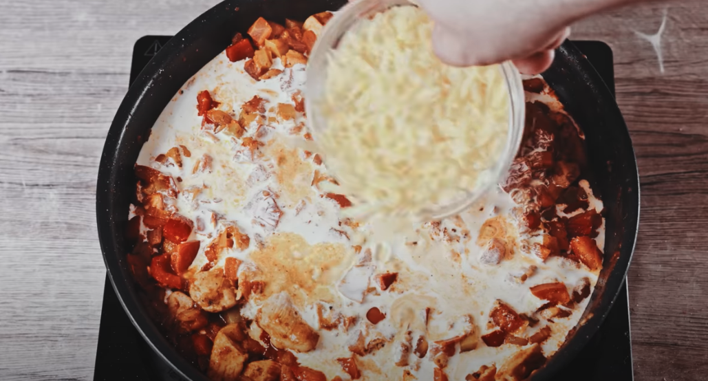Pokrój pomidory w kostkę i dodaj do patelni, gotuj przez 8 minut, aż pomidory się rozpadną i powstanie sos. Dodaj usmażone kawałki kurczaka z powrotem na patelnię i dobrze wymieszaj. Zetrzyj 100 g sera na drobno i posyp nim wierzch potrawy. Przykryj patelnię i gotuj przez 4 minuty, aż ser się roztopi. Drobno posiekaj 200 g koperku i dodaj do gotowego dania. Wszystko delikatnie wymieszaj.