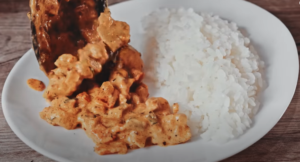 Pokrój pierś z kurczaka na małe kawałki. Rozgrzej 1 łyżkę stołową oleju i 60 g masła na dużej patelni na dużym ogniu. Dodaj pokrojonego kurczaka i smaż przez 7-10 minut, aż będzie złocisty. Następnie zdejmij kurczaka z patelni i odłóż na bok. Pokrój cebulę w pióra i dodaj do tej samej patelni, smaż przez 5 minut, aż zmięknie.