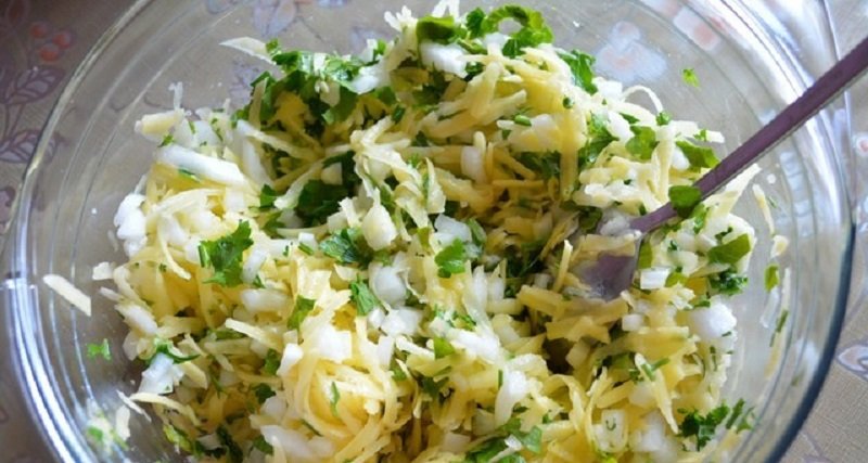 Obrane ziemniaki zetrzyj na tarce o grubych oczkach, ewentualnie możesz pokroić je w cieniutkie plasterki. Obraną cebulę poszatkuj w małe kawałeczki. Natkę pietruszki dokładnie umyj i posiekaj (odłóż trochę do dekoracji gotowego dania). Tak przygotowane składniki przełóż do głębokiej miski i dokładnie wymieszaj.
