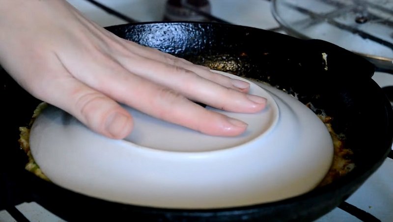 Smaż pod przykryciem na małym ogniu przez około 15 minut. Po uzyskaniu złotego koloru przełóż placek na drugą stronę (pomocna może być łopatka lub drugi talerz). Ponownie smaż pod przykryciem przez 15 minut.