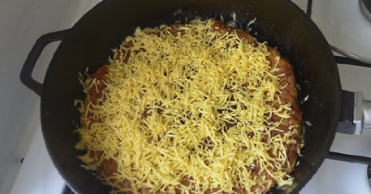 Gorące danie wyjmij z patelni i posyp uprzednio startym żółtym serem. Po około 5 minutach ser pięknie stopnieje.