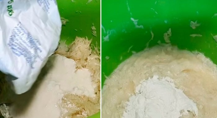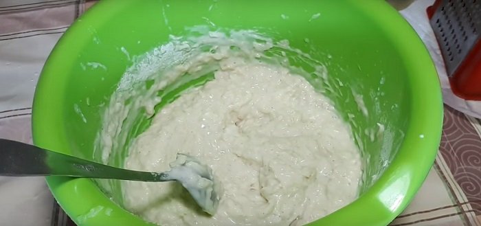 Następnie dodajemy jajko, kefir, mąkę z proszkiem do pieczenia oraz sól i pieprz – ponownie dokładnie mieszamy do uzyskania masy o konsystencji śmietany.
