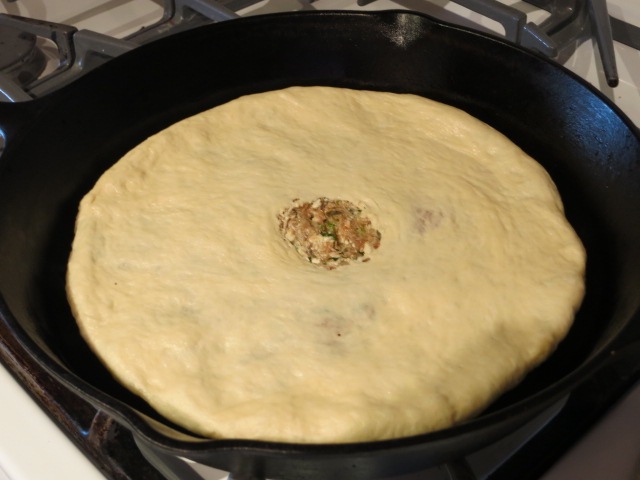 Nałóż taką samą ilość przygotowanego nadzienia na wszystkich plackach. Złącz brzegi ciasta nad nadzieniem, a następnie zgnieć je ponownie na płaskie placuszki.