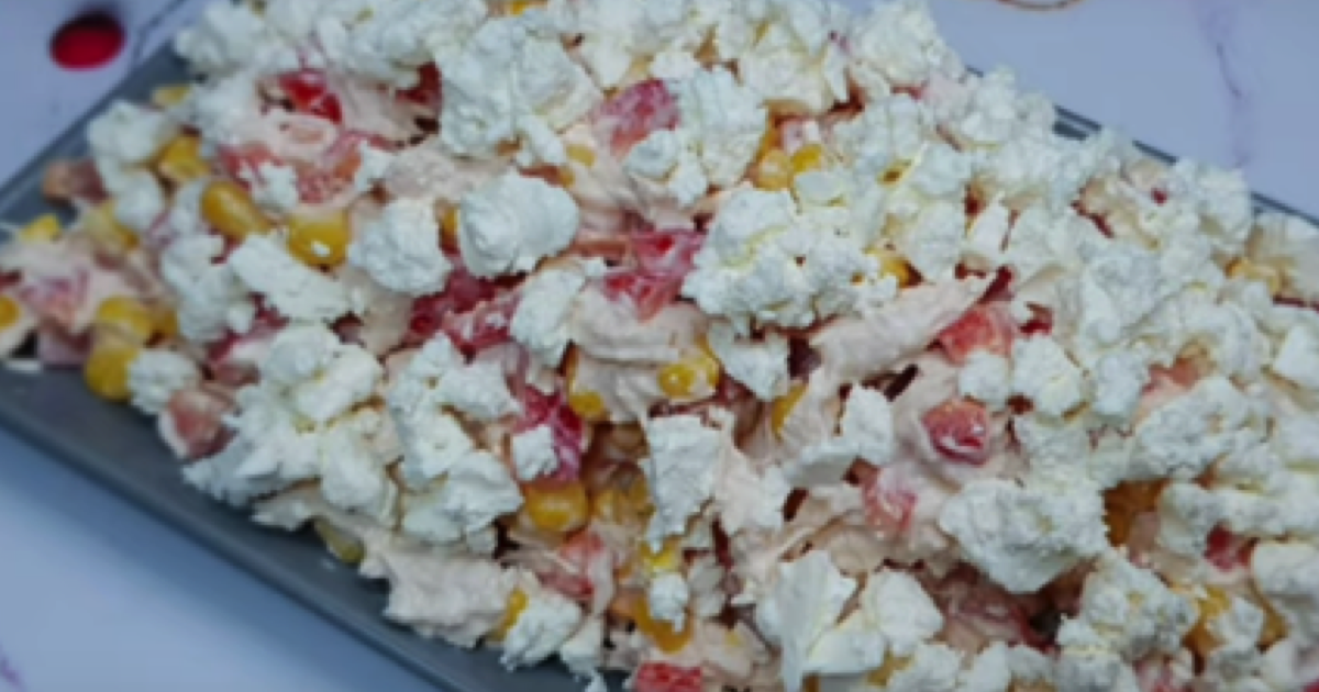 W tym czasie możesz zająć się przygotowywaniem pozostałych składników. Pokrój paprykę w kawałki, które najbardziej Ci odpowiadają. Podobnie postąp z serem feta. Odsącz kukurydzę. Po wystygnięciu kurczaka, postąp z nim jak z resztą składników-pokrój w odpowiednie dla siebie kawałki.