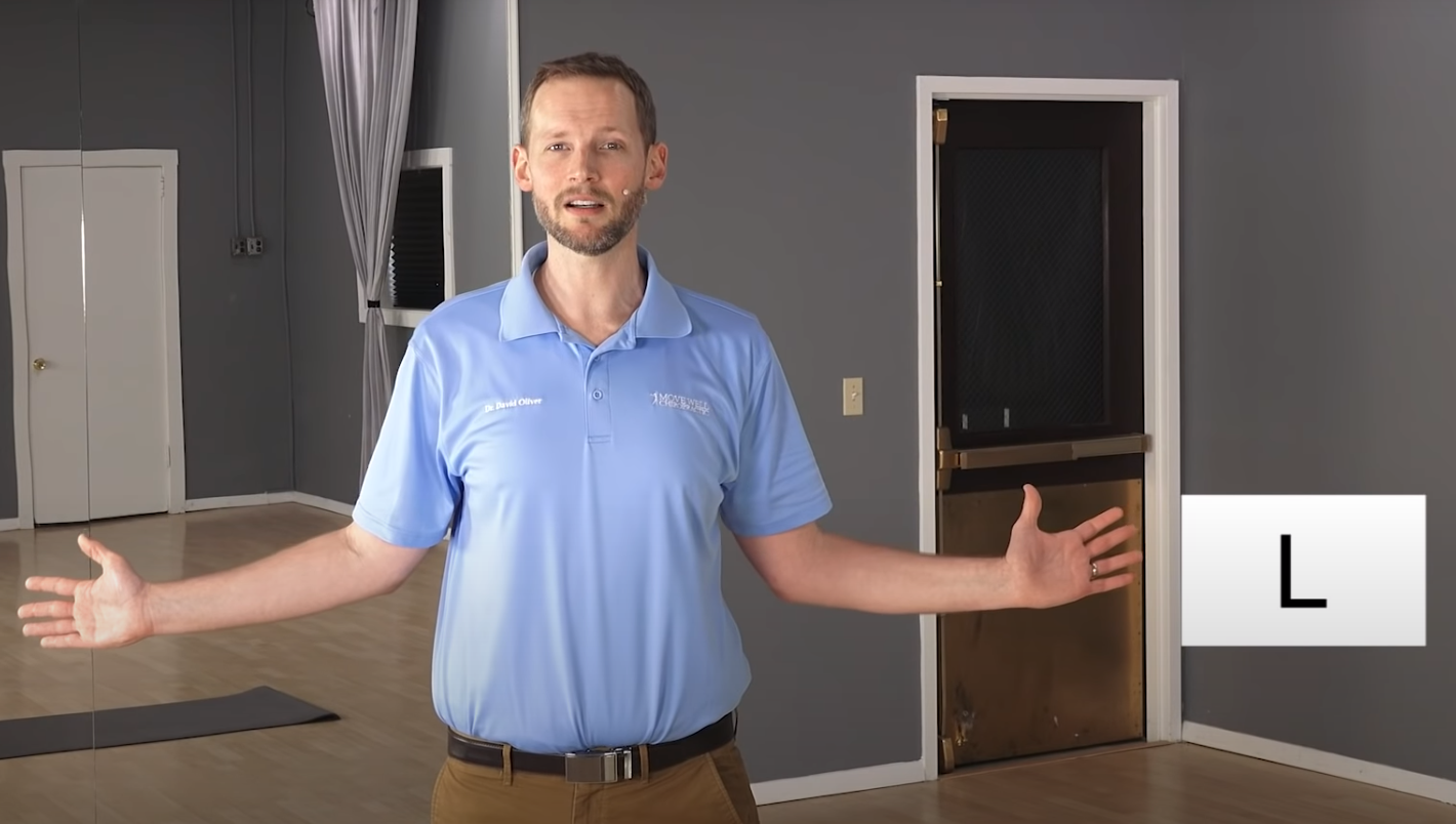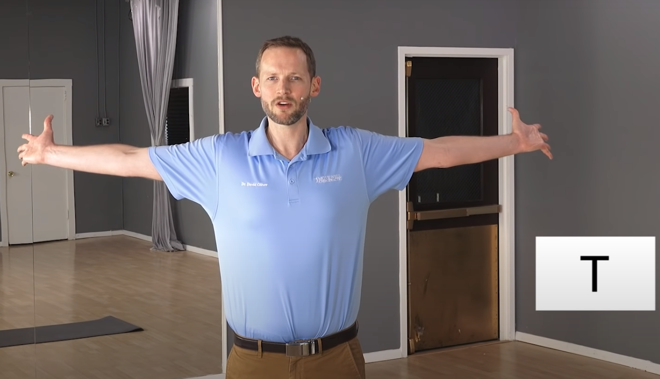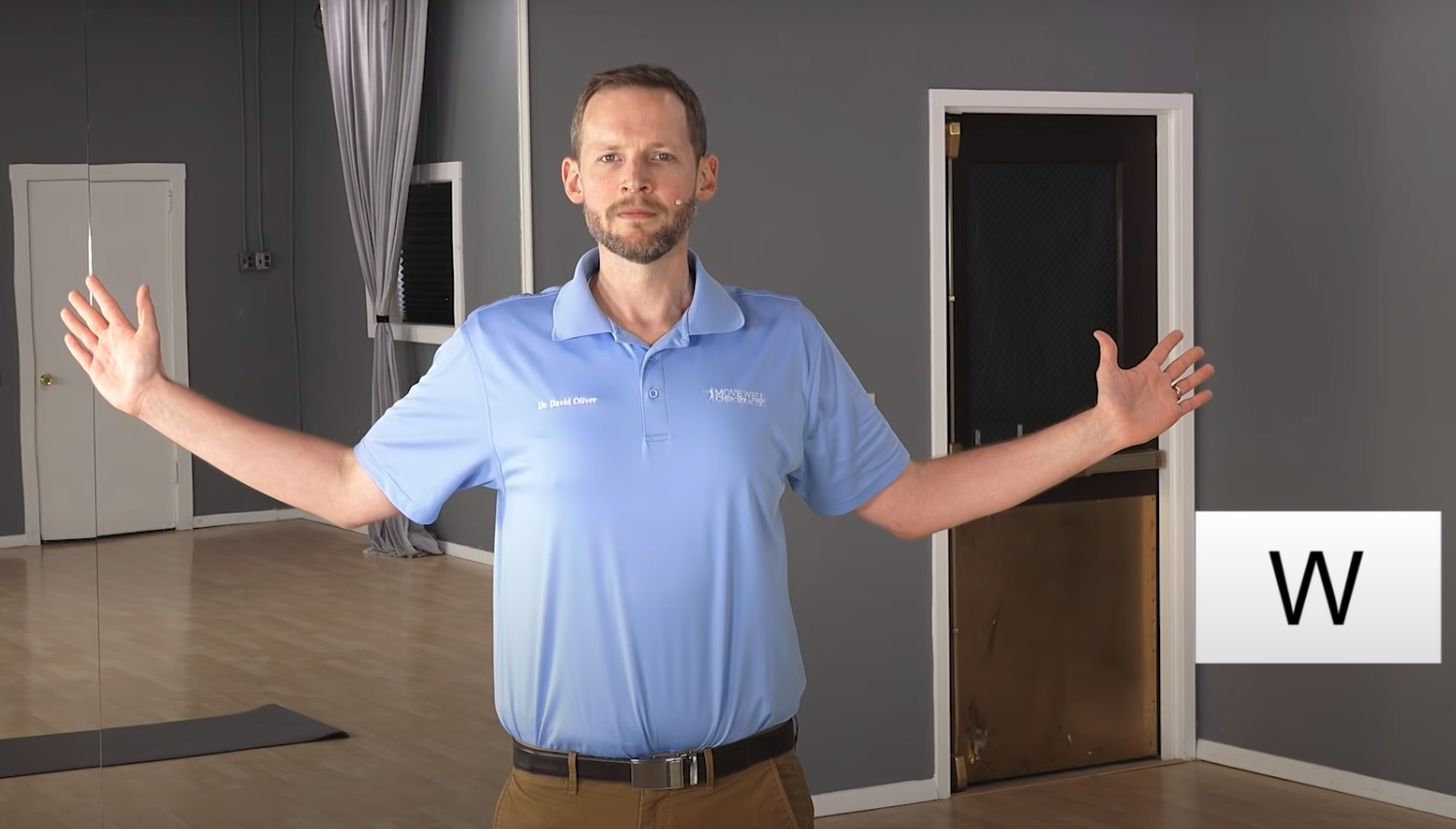 Następnie opuść ramiona do pozycji „W”, po czym zrób głęboki wdech jeszcze dwa razy.