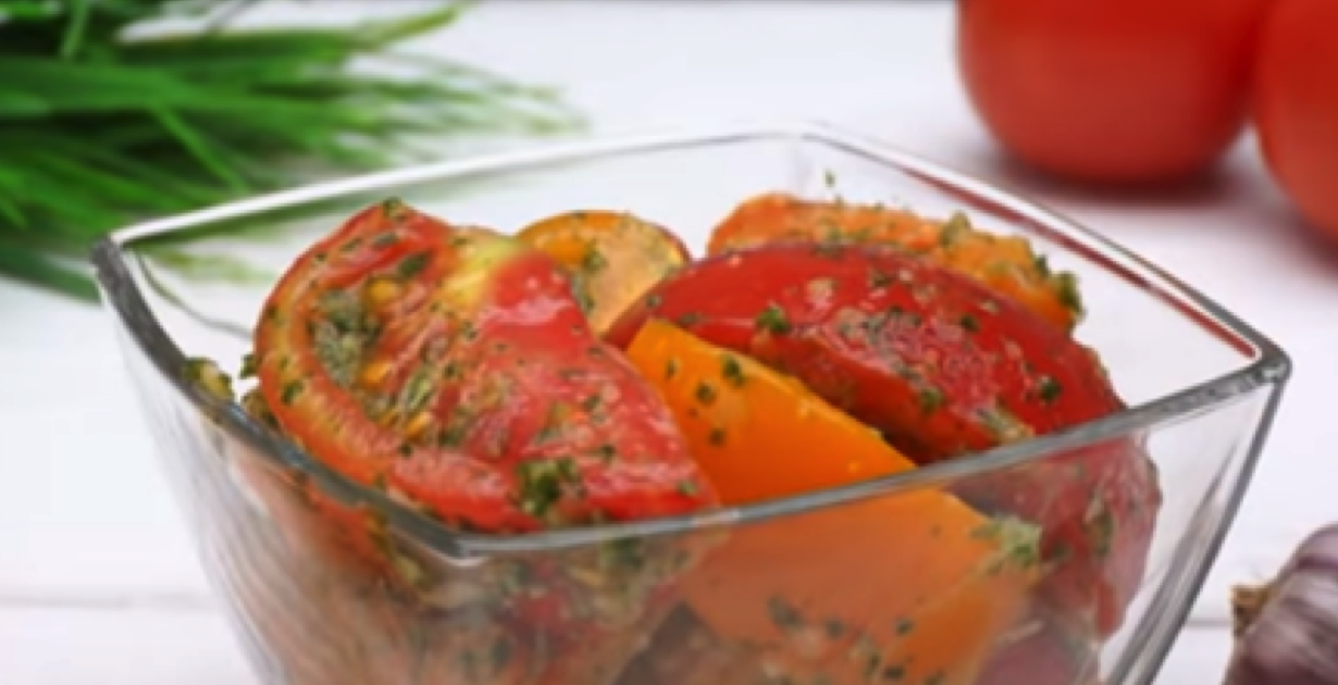 Pomidory dokładnie umyć i pokroić je w plasterki. Umieścić je w dokładnie wysterylizowanym słoiku. Paprykę oczyścić z nasion i umyć je także krojąc w plastry. Natkę pietruszki należy posiekać, a czosnek po obraniu również posiekać, ale na większe kawałki. Wszystkie składniki zblendować z dodatkiem octu, roślinnego oleju, jak również cukru oraz soli.