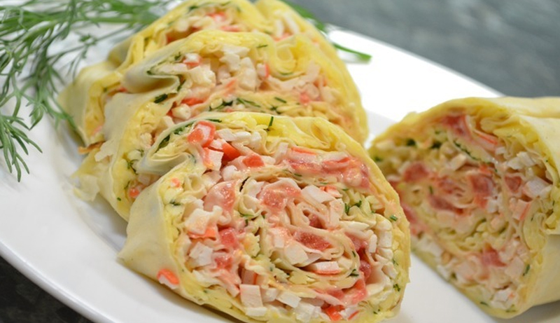 Rozsmaruj na całości placka tortilli serek śmietankowy. Na wierzchu rozłóż sałatę lodową lub zielone liście kapusty pekińskiej. Na jednym końcu placka rozłóż wędzonego łososia, w środku starty ser żółty, a na drugim krańcu drobno pokrojone paluszki krabowe.