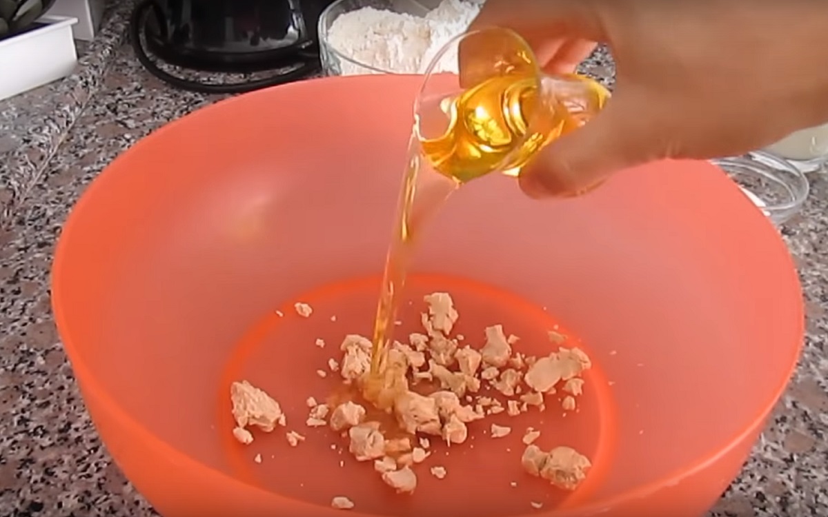 Drożdże rozdrabniamy i łączymy z olejem słonecznikowym. Następnie dodajemy mleko i sól. Wszystko dobrze mieszamy. Do miski stopniowo wsypujemy mąkę zagniatając całość aż do uzyskania odpowiedniej konsystencji ciasta.