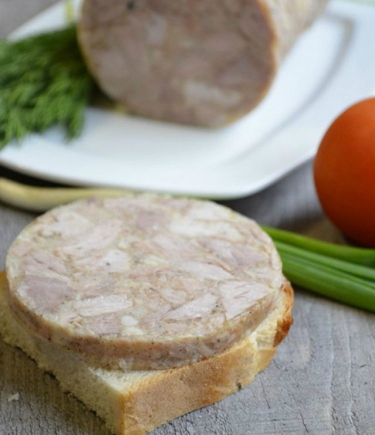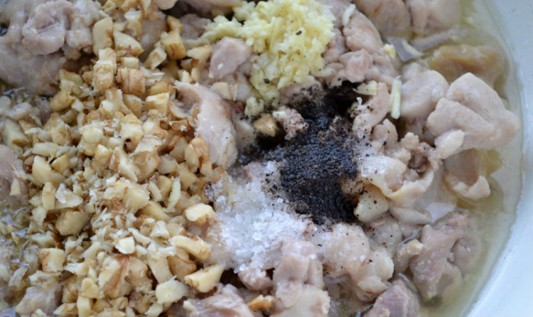 Żelatynę połącz z bulionem, wymieszaj starannie. Orzechy podsmaż delikatnie na suchej patelni. Dodaj je do mięsa wraz z przeciśniętym przez praskę czosnkiem. Dopraw solą i przyprawami, następnie zalej bulionem z żelatyną.