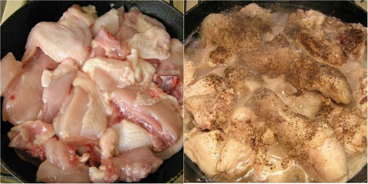 Mięso pokrój starannie na kawałki. Najlepiej aby były one średniej wielkości. Przełóż je na patelnię z grubym dnem, najlepiej żeliwną i duś pod przykryciem, we własnym soku, bez dodawania oleju. Dopraw solą i pieprzem i duś jeszcze około 45 minut.