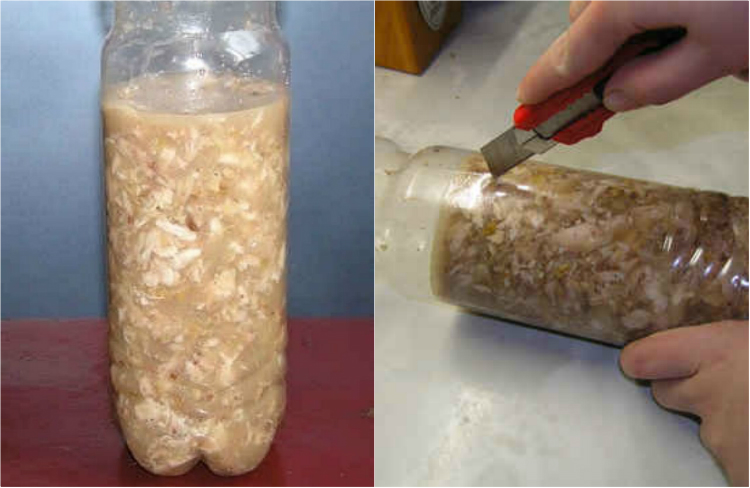 Od plastikowej butelki odetnij szyjkę. Przełóż do jej wnętrza mieszaninę, całkowicie schłodzoną. Całość umieść w lodówce, aż stężeje.