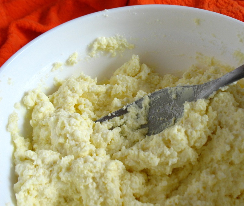 Roztopioną margarynę, twarożek, cukier, wanilię, sól i żółtka wrzucić do jednej miski i wymieszać wszystko na jednolitą masę. Wszystkie składniki powinny być w temperaturze pokojowej.