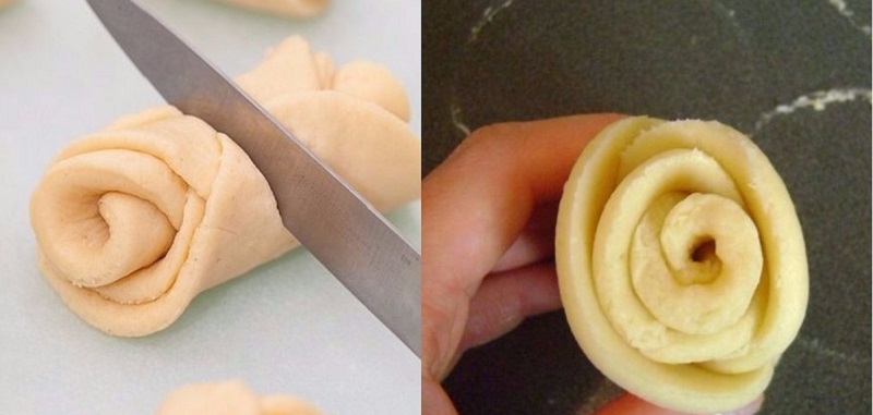 Rozwałkować ciasto na placki o grubości 2-3 milimetry i wyciąć z nich kółka przy pomocy szklanki. Trzy kółka ułożyć na sobie i zawinąć w rulonik, który przecięty na pół da dwie róże.
