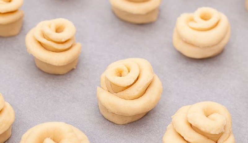 Na blaszkę z papierem do pieczenia ułożyć ciastka róże i piec od 20 do 30 minut w piekarniku nagrzanym do 160 stopni.