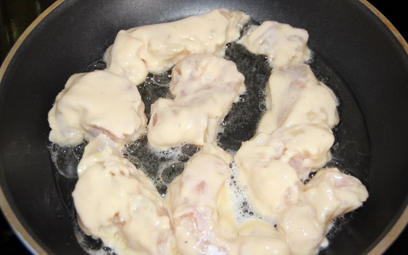 Jajka za pomocą miksera ubić z solą, dosypać 2 łyżki skrobi. Starannie ze sobą połączyć. Aby płaty ryby dobrze się usmażyły zalecane jest ustawienie palnika na dużym ogniu.