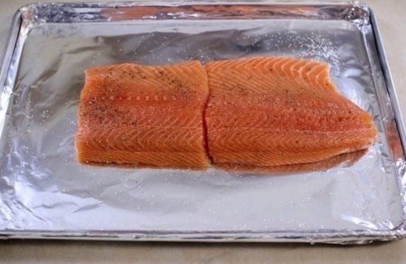 Filet z łososia umyć dokładnie i osuszyć. Upewnić się, że na pewno nie ma ości. Natrzeć łososia solą i pieprzem, a następnie ułożyć go na blasze wyłożonej folią do pieczenia.
