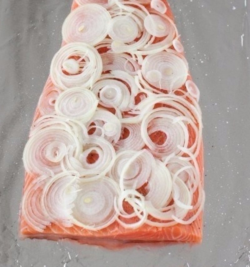 Umyć, osuszyć i obrać cebulę. Pokroić w cienkie plasterki i ułożyć gęsto na łososiu.