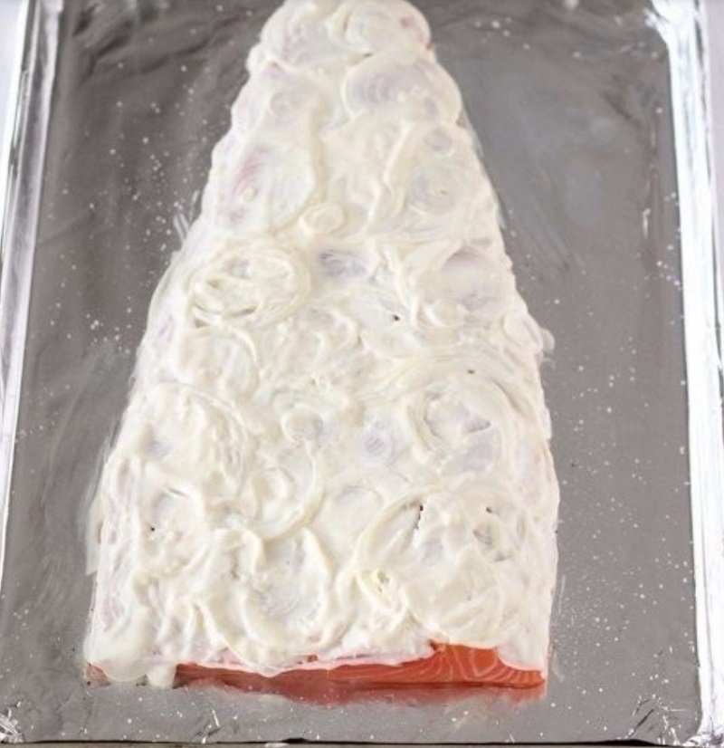 Majonez razem z sokiem z cytryny i musztardą wymieszać. Posiekać drobno czosnek i dodać do sosu. Wszystko razem wymieszać do gładkiej konsystencji, a następnie rozprowadzić po cebuli ułożonej na rybie.