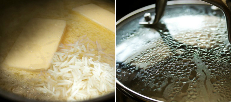 Ryż najlepiej gotować w garnku z grubym dnem, dzięki czemu unikniemy przywierania potrawy do naczynia. Wody powinno być w nim dwa razy więcej niż ryżu (na szklankę ryżu wlewamy dwie szklanki wody). Gotujemy ryż na dużym ogniu przez trzy minuty, po czym dodajemy do niego sól do smaku oraz trochę masła.