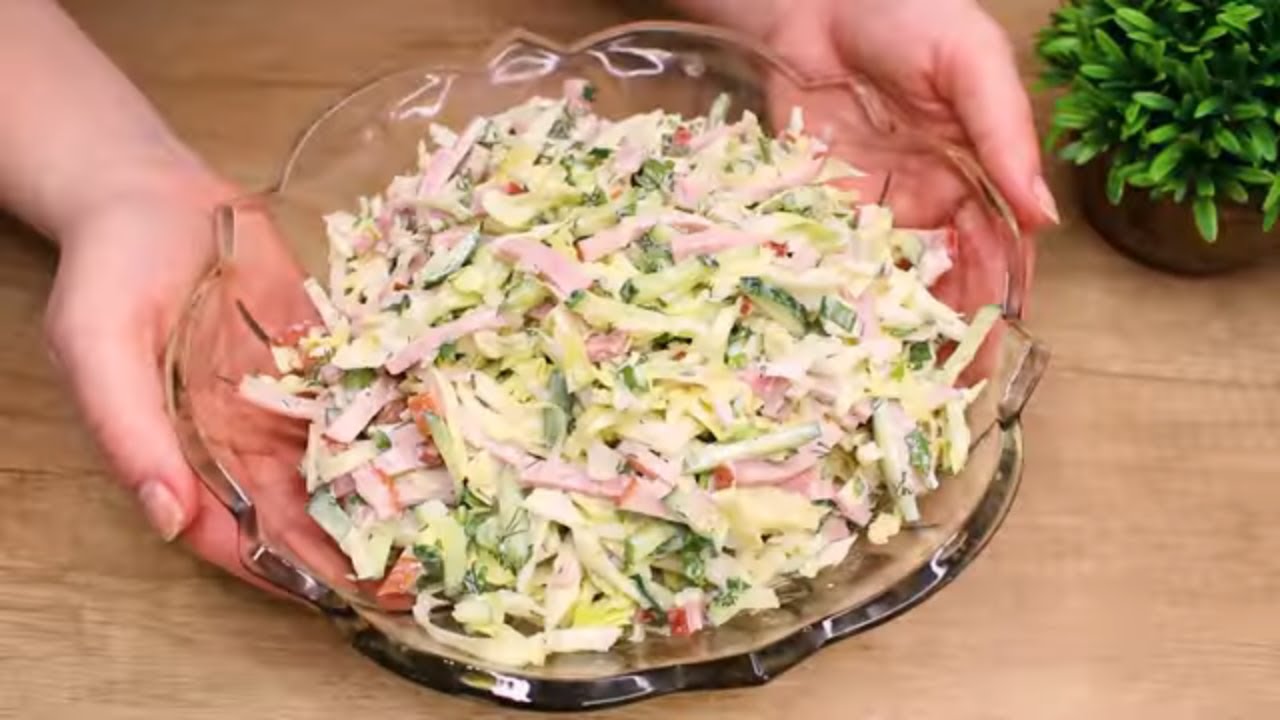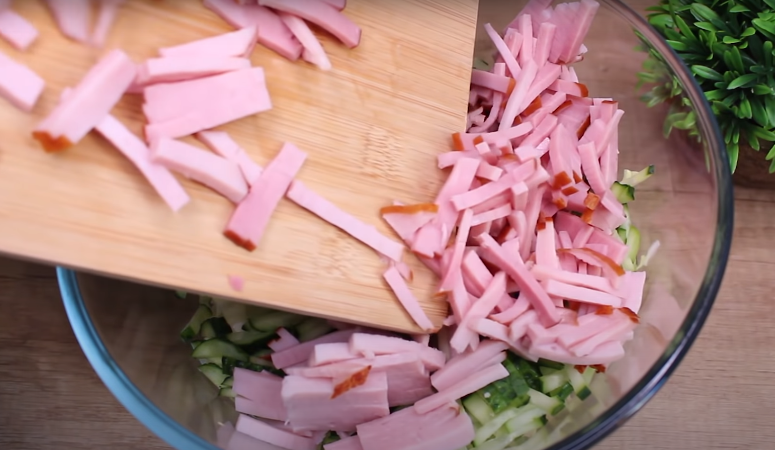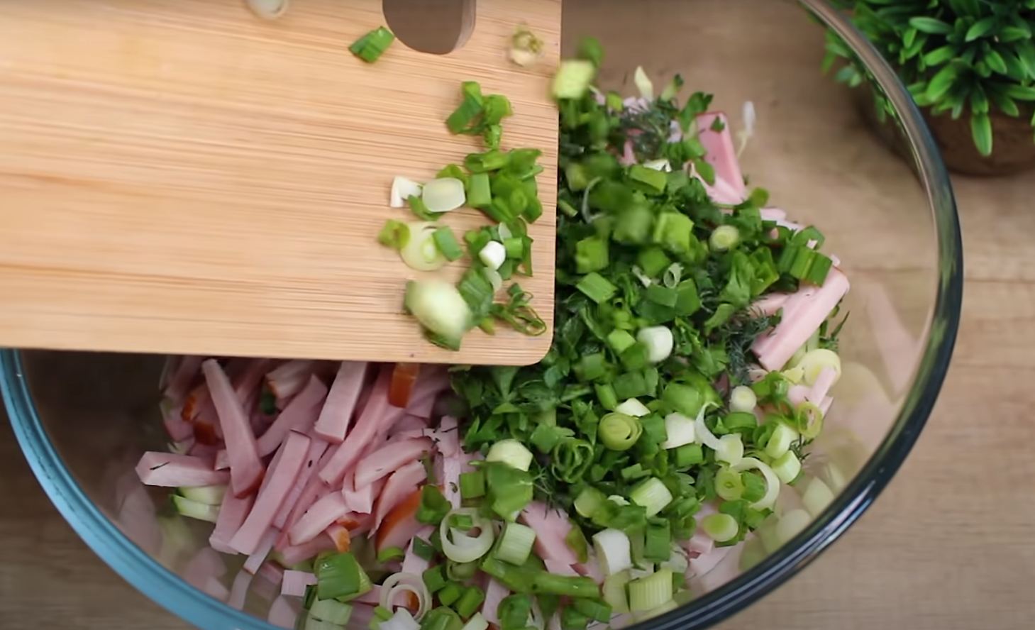 Dodać do miski pokrojoną kapustę. Dodać szynkę pokrojoną na małe kawałki. Do przygotowanych składników dodać cebulę dymkę, pietruszkę i koperek.