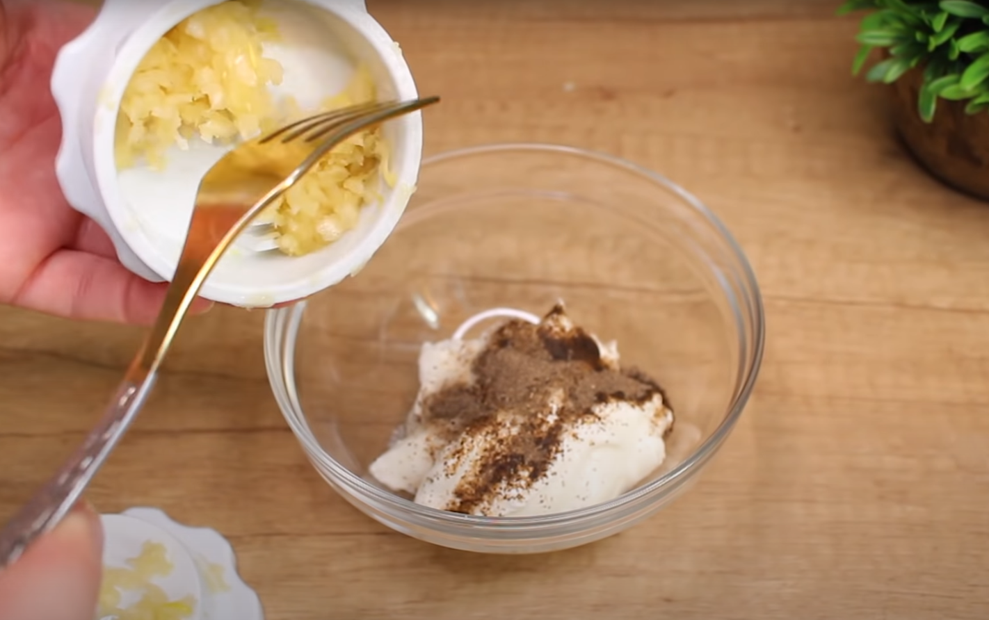 W osobnej miseczce przygotuj sos, mieszając śmietanę (lub jogurt) z solą, pieprzem i świeżo wyciśniętym czosnkiem.