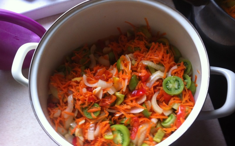 Przede wszystkim należy obrać warzywa, czyli: paprykę, marchew oraz cebulę. Pomidory należy obrać i pokroić na małe plasterki, marchew zetrzeć na grubej tarce, cebulę i paprykę pokroić w pół pierścienie. Następnym krokiem jest wzięcie dużej miski.