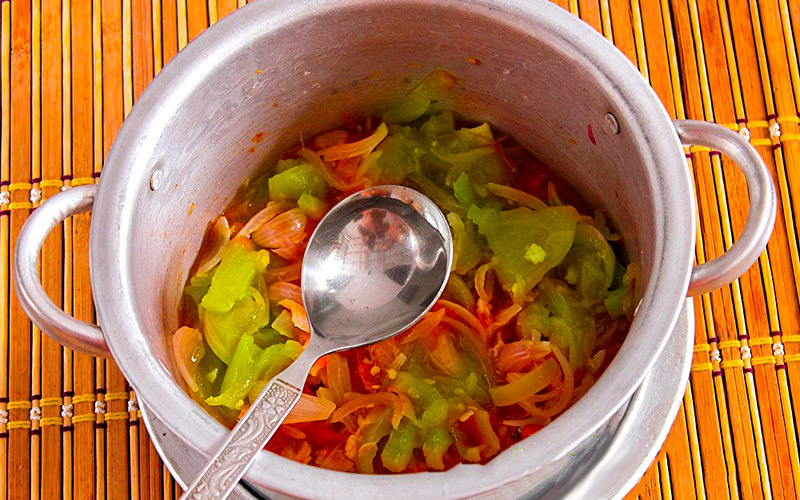 Można do tego wykorzystać ręce lub specjalne łopatki. Po wymieszaniu sałatkę należy odstawić na około godzinę, aż puści ona odpowiednią ilość soków. Oczywiście w razie potrzeby można dosypać soli, aby smak był odpowiedni. Taką mieszaninę należy gotować przez około 20 minut na wolnym ogniu.