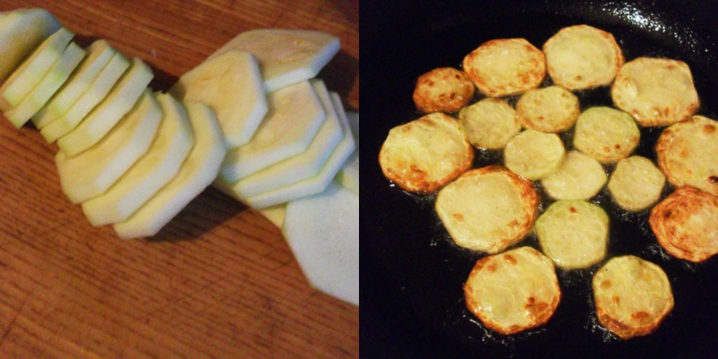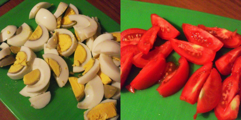 Cukinię smażymy na gorącym oleju z obu stron do uzyskania złotego koloru. Usmażone plastry układamy na ręczniku papierowym, by odsączyć nadmiar tłuszczu. Ostudzoną cukinię kroimy w półplastry, pomidory w ósemki, jajka w ćwiartki. Czosnek, cebulę i natkę pietruszki drobno siekamy.