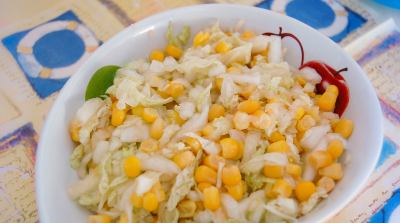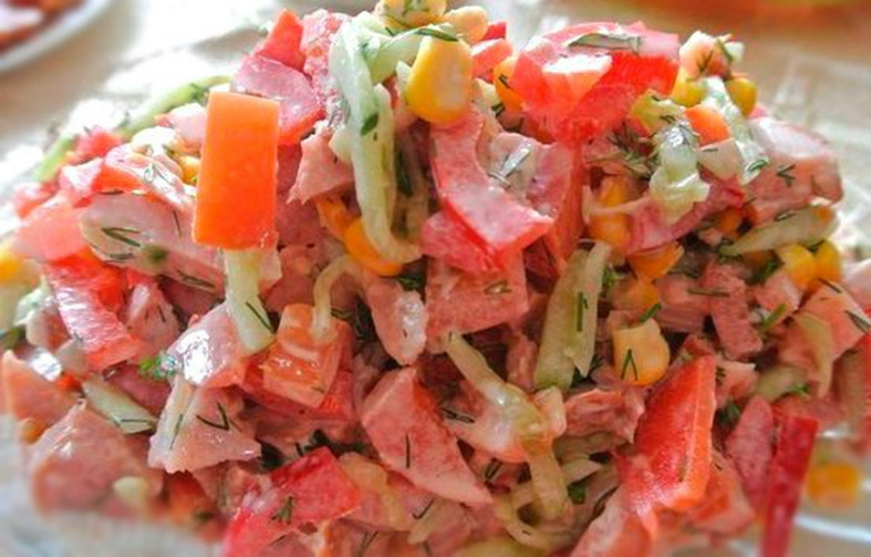 Filet z kurczaka pokój w cienkie paski. Ogórka, pomidora oraz paprykę pokrój w paski lub średniej wielkości kostkę. Dodaj kukurydzę. Wymieszaj jogurt z przyprawami, a następnie polej sałatkę powstałym sosem.