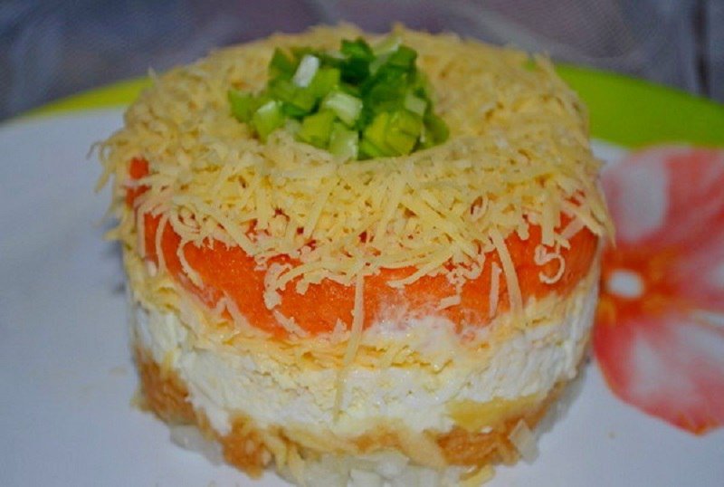 Ułożoną sałatkę wkładamy do lodówki na co najmniej godzinę. Po tym czasie odwracamy miseczkę do góry dnem, wyjmując sałatkę na talerzyk.