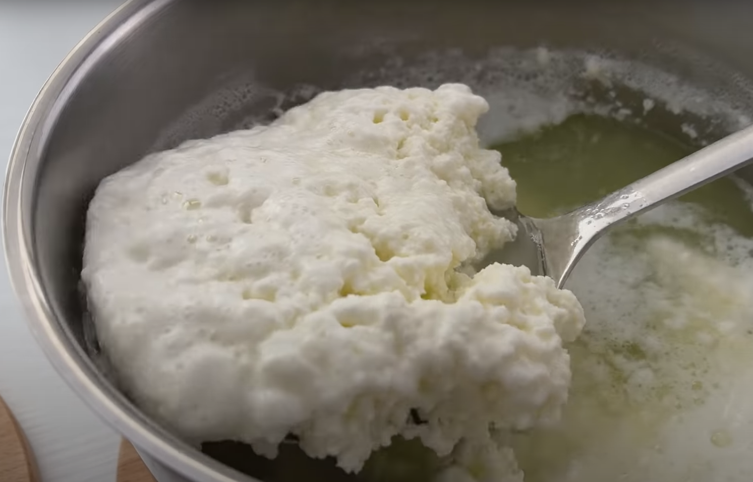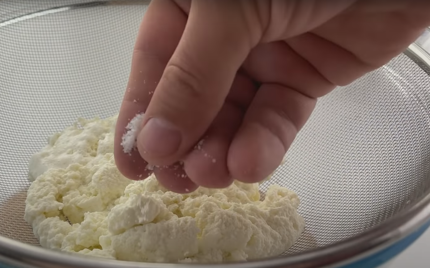 Zmniejszyć ogień do gotowości na wolnym ogniu i pozwolić, aby serwatka się oddzieliła. Następnie, przecedzić mieszaninę umieszczając ją w sitku. Pozwól jej odsączyć się z nadmiaru płynu. Klasyczny przepis polega na połączeniu mieszaniny w misce. Dodaj szczyptę soli do smaku i mieszaj mieszankę mikserem przez około 1-2 minuty.