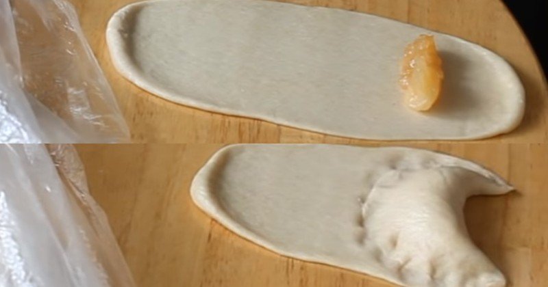 Na jednym końcu ciasta umieść jedną łyżkę stołową ulubionego nadzienia i złącz krawędzie.