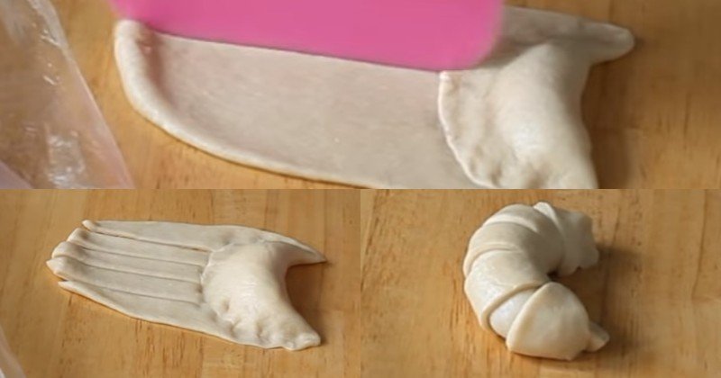 Pozostałą ilość ciasta pokrój w cztery długie paski i zagnij je tak, by uformować rogaliki.