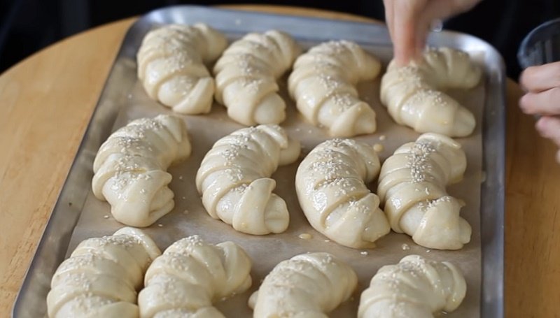 Przygotuj sobie blachę do pieczenia i wyłóż ją specjalnym papierem. Następnie ułóż na niej przygotowane rogaliki i odstaw na 20 minut. Ubij drugie jajko, a następnie posmaruj nim przyszłe wypieki. Posyp je także ziarnami sezamu.