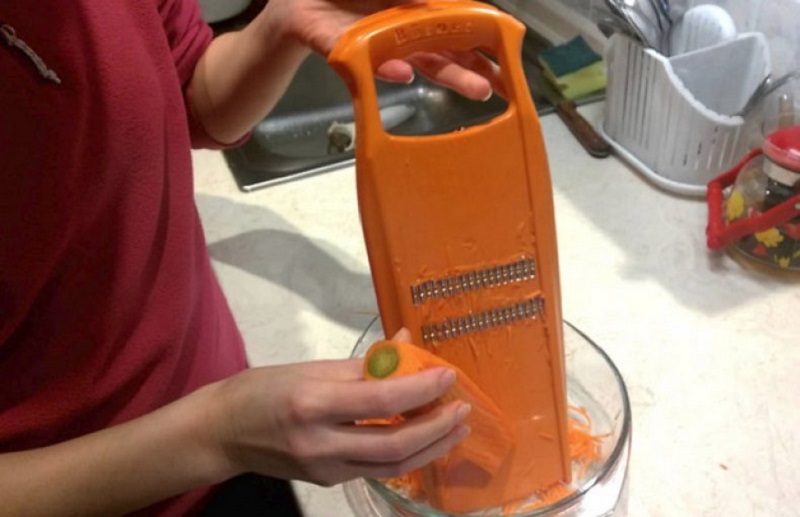 Marchew myjemy i obieramy, a następnie musimy ją zetrzeć na tarce która sprawi, że otrzymamy długie paseczki, im dłuższe tym lepiej. Posypujemy cukrem i solą, dolewamy octu i bardzo dokładnie mieszamy przez co najmniej 3 minuty, żeby składniki miały możliwośc się połączyć.
