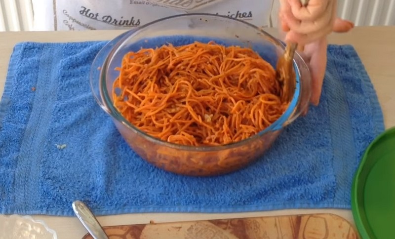 Czosnek obieramy, siekamy. Dorzucamy do marchewki i znów odstawiamy na około 10-15 minut, żeby się przegryzła. Na sam koniec dodajemy szczyptę zmiażdżonych nasion kolendry (można pominąć ten krok). Daniem można się delektować od razu, ale zalecane jest odstawienie całości na kilka godzin w temperaturze pokojowej, a potem do lodówki na około 3 godziny.