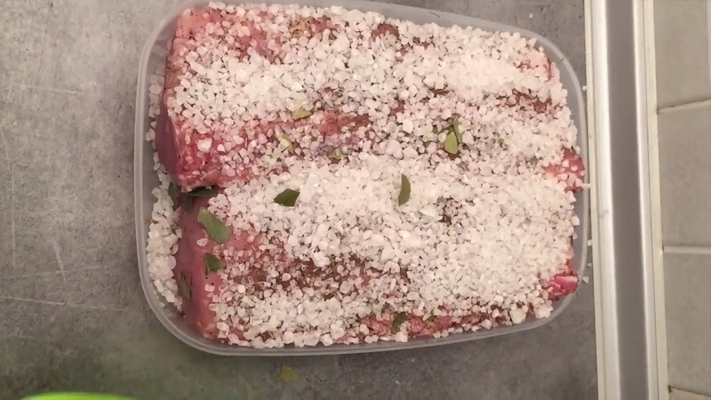 Mięso należy natrzeć wszystkim przyprawami i włożyć do średniej wysokości pojemnika. Kolejnym krokiem jest obsypanie produktu solą, tak by była ona widoczna z każdej strony potrawy. Tak przyrządzony kawałek wieprzowiny włożyć do lodówki na okres 2 dni.