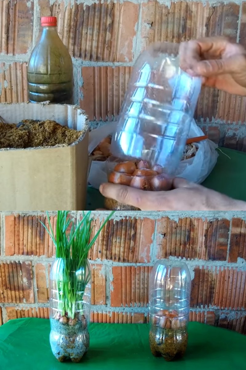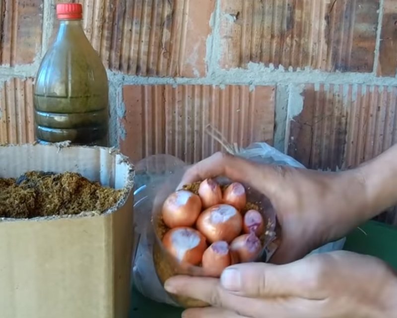 Dno butelki napełnij materiałem, który łatwo zachowa wilgoć, np. trocinami, papierem toaletowym, częściami starych ubrań. Przygotuj 5-7 sztuk cebul, mniej więcej wielkości kurzego jaja. Odetnij górną część każdej z nich w taki sposób, aby odsłonić miąższ.