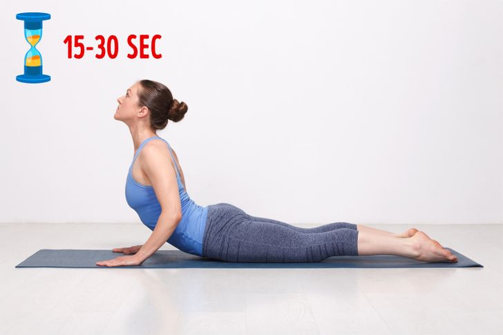 Umieść dłonie pod ramionami i połóż się na brzuchu. Weź głęboki wdech i unieś ciało. Następnie wyprostuj ramiona. Następnie pochyl się w kierunku dolnej części pleców i klatki piersiowej. Wyciągnij szyję. Pozostań w tej samej pozycji przez 15-30 sekund.
