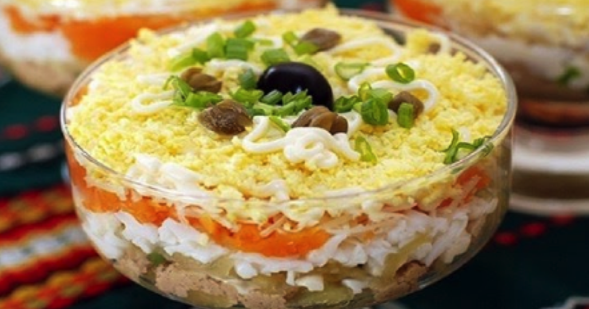 Najpierw ugotuj pierś z kurczaka i pozostaw ją do ostygnięcia. W między czasie ugotuj również jajka na twardo. Potem zajmij się warzywami: zetrzyj marchew i cebulę na grubej tartce, podsmaż na oleju roślinnym i przełóż je do dużej miski. Na tej samej patelni podsmaż pokrojone w plasterki pieczarki.