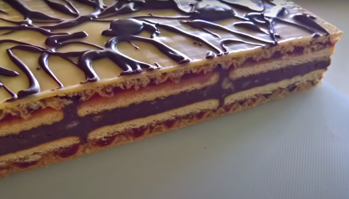Gotową masę rozsmarować na warstwie herbatników na jednym waflu. Po zastygnięciu masy przykryć ją kolejnymi 17 herbatnikami. Następnie ponownie przykryć ją kolejnym waflem, a na wierzchu rozsmarować dżem. Po rozłożeniu wafli należy koniecznie obciążyć przekąskę czymś cięższym. Ubitą masę należy przechowywać w lodówce przez co najmniej 2 godziny.