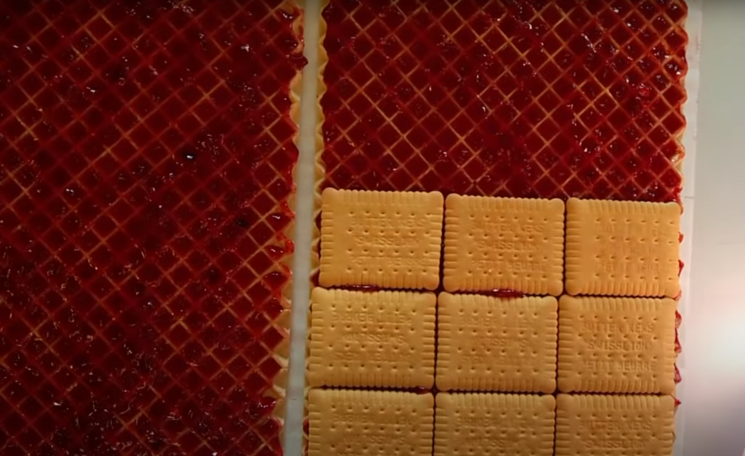 Na początek potrzebne będą dwa duże gofry. Rozsmaruj na nich dżem (ok. 350 g), a następnie dodaj kilka herbatników (ok. 17 sztuk). Następnie do rondelka wlej 100 ml wody i dodaj 100 g cukru. Włącz ogień i gotuj płyn, aż całkowicie się rozpuści.