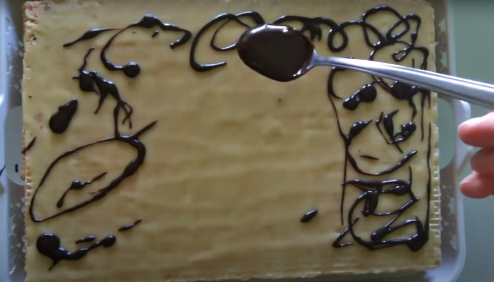 Ponieważ można jeszcze udekorować ciasto. W rondelku połącz 50 g białej czekolady z odrobiną śmietanki. Rozpuść czekoladę na wyjętych z lodówki waflach, gdy tylko się rozpuści. To samo możesz zrobić z 50 g posiekanej gorzkiej czekolady. Rozpuść śmietankę, dodaj ją do masy, a następnie udekoruj przekąskę bitą śmietaną (po ostygnięciu masy z białej czekolady). ).