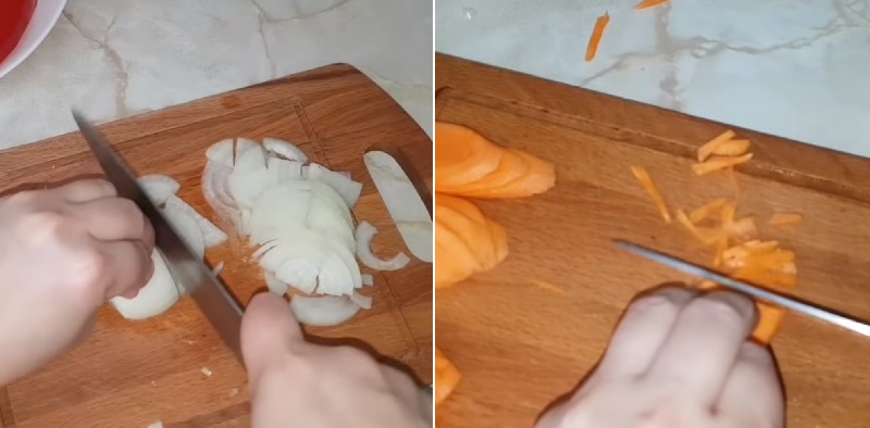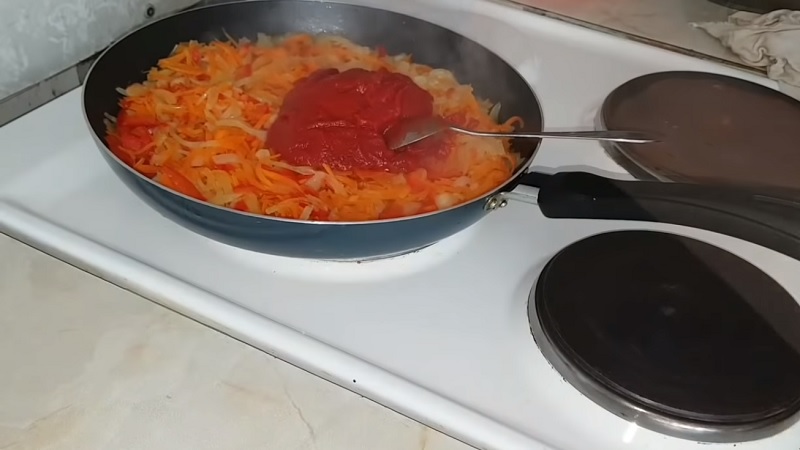 Cebulę i marchewkę obrać, a potem drobniutko posiekać i usmażyć na patelni z odrobiną oleju roślinnego. Smażyć przez około 5 -7 minut. Do warzyw dodać drobno pokrojoną paprykę. Do warzyw wlać koncentrat pomidorowy i wszystko razem wymieszać do połączenia się składników.