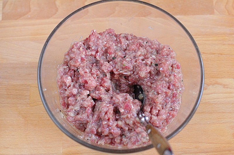 Powoli wlewaj wodę do farszu, aby nie przyklejał się do dłoni. Mieszaj przez następne 10 minut. Następnie dodaj oliwę z oliwek i mieszaj jeszcze przez 5 minut. Owiń farsz plastikową folią i odstaw do lodówki na jeden dzień.
