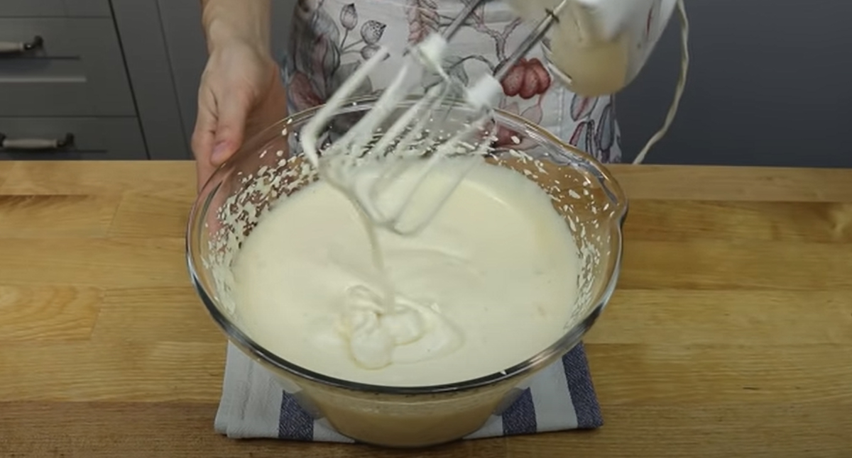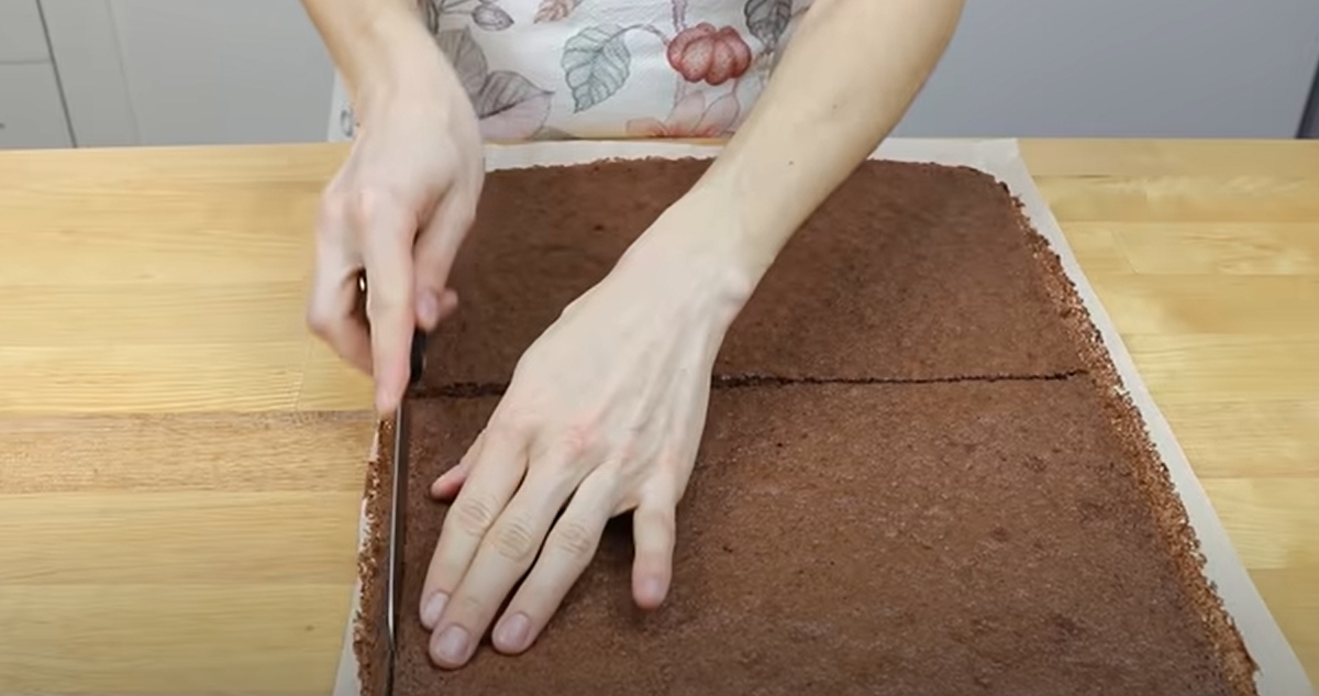 Po upieczeniu ciasto można sprawdzić za pomocą patyczka. Po upieczeniu pozostawić biszkopt do całkowitego ostygnięcia. Przekrój biszkopt na pół i w razie potrzeby przytnij boki. Jedną porcję biszkoptu przełóż do kwadratowej formy wyłożonej papierem do pieczenia lub folią spożywczą.
