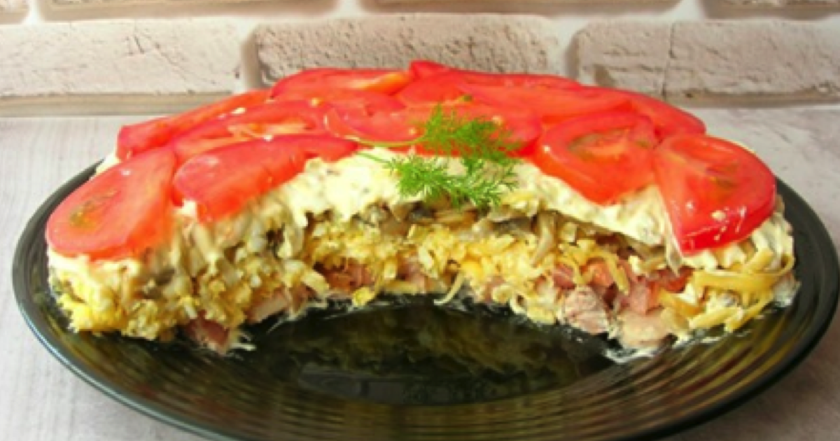 Następnie znowu kładziemy majonez, a na niego smażone grzyby i cebulę. Rozkładamy pozostałą resztkę jajek. Całość ponownie smarujemy majonezem i na wierzch kładziemy pomidory, które wcześniej należy pokroić na cienkie plasterki. Nasza sałatka jest gotowa.